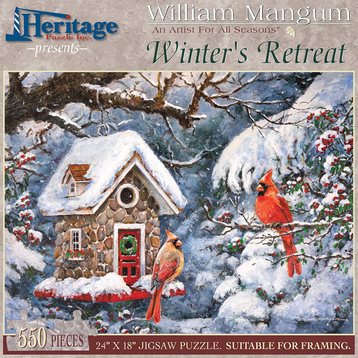 This beautiful puzzle features a pair of cardinals settling into their Winter Retreat. A puzzle that will be fun for the entire family. 550 pieces, 24" x 18".