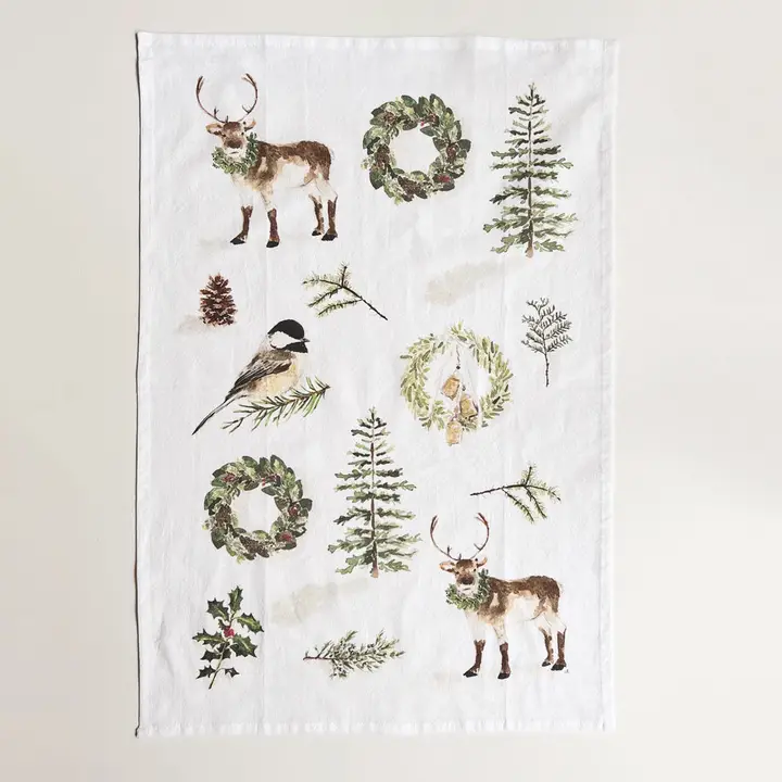 Add a touch of delight to your kitchen with this 100% cotton tea towel. Evergreen illustrations cover the towel making it perfect for washing up, lining a basket, wrapping up treats, or setting out to add a touch of Christmas charm to your home. Details: - 100% cotton flour sack tea towel - 19" x 28" - Loop for hanging - Machine wash and dry - Original watercolor artwork by Emily Lex