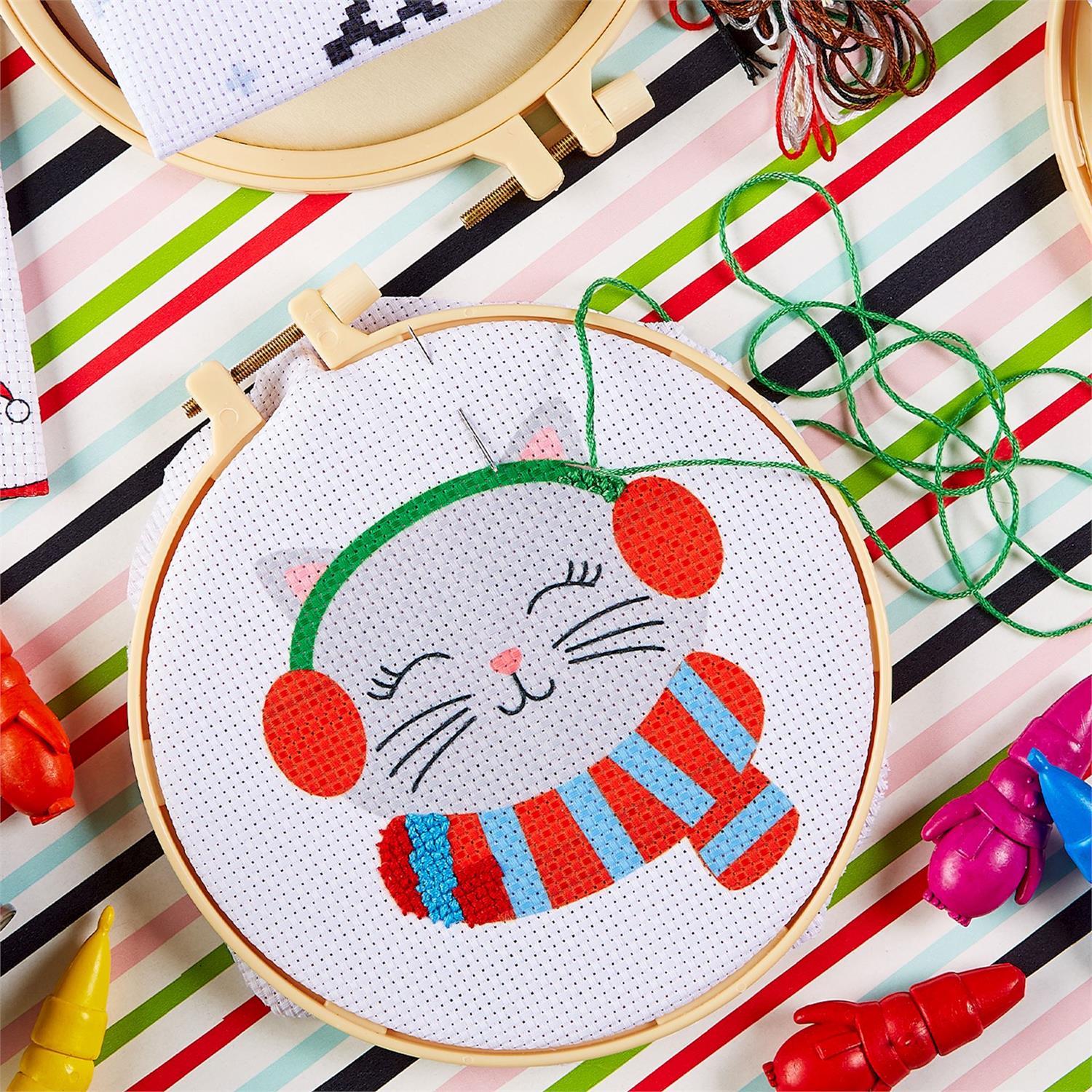 - Includes hoop frame, printed pattern on aida fabric, color threads, and needle