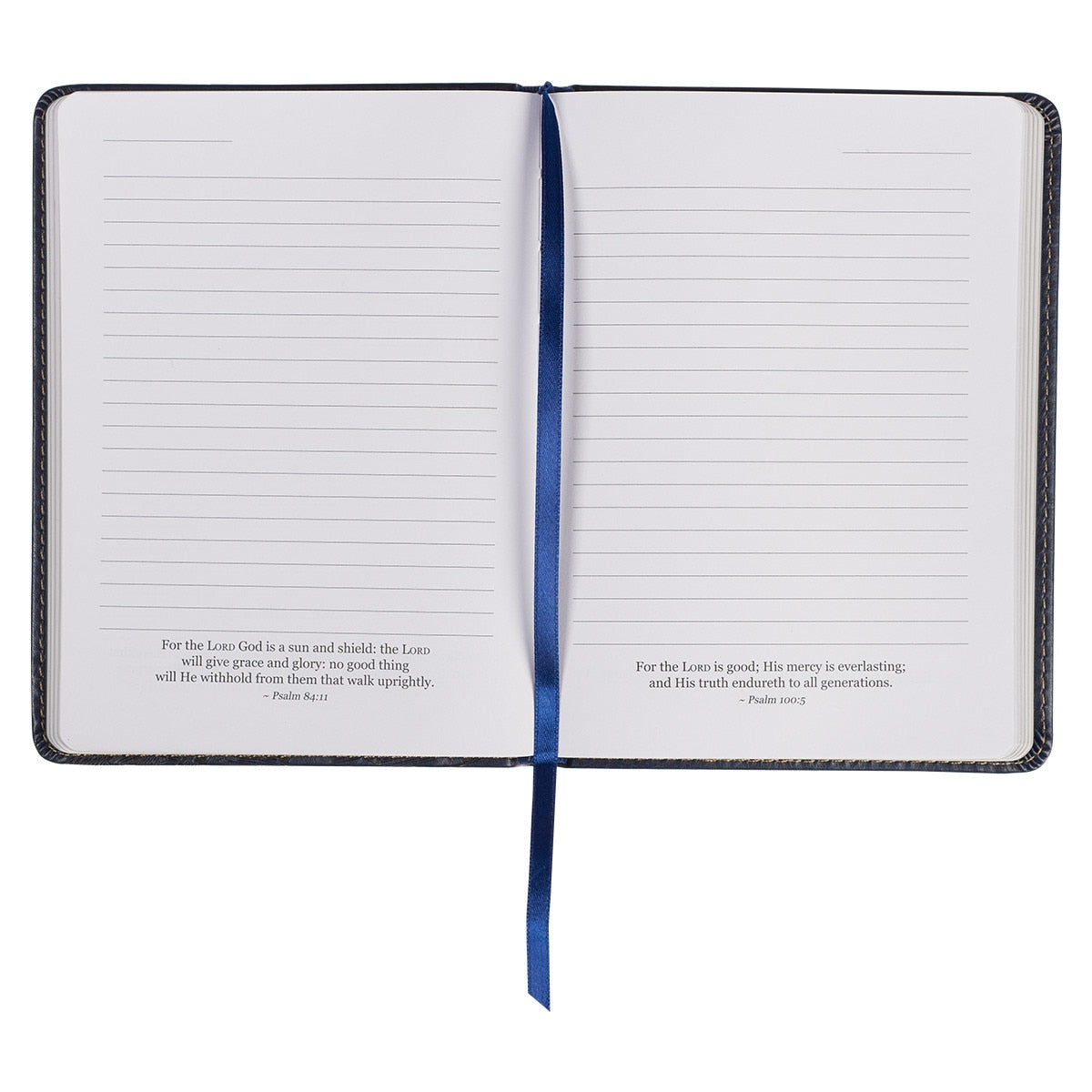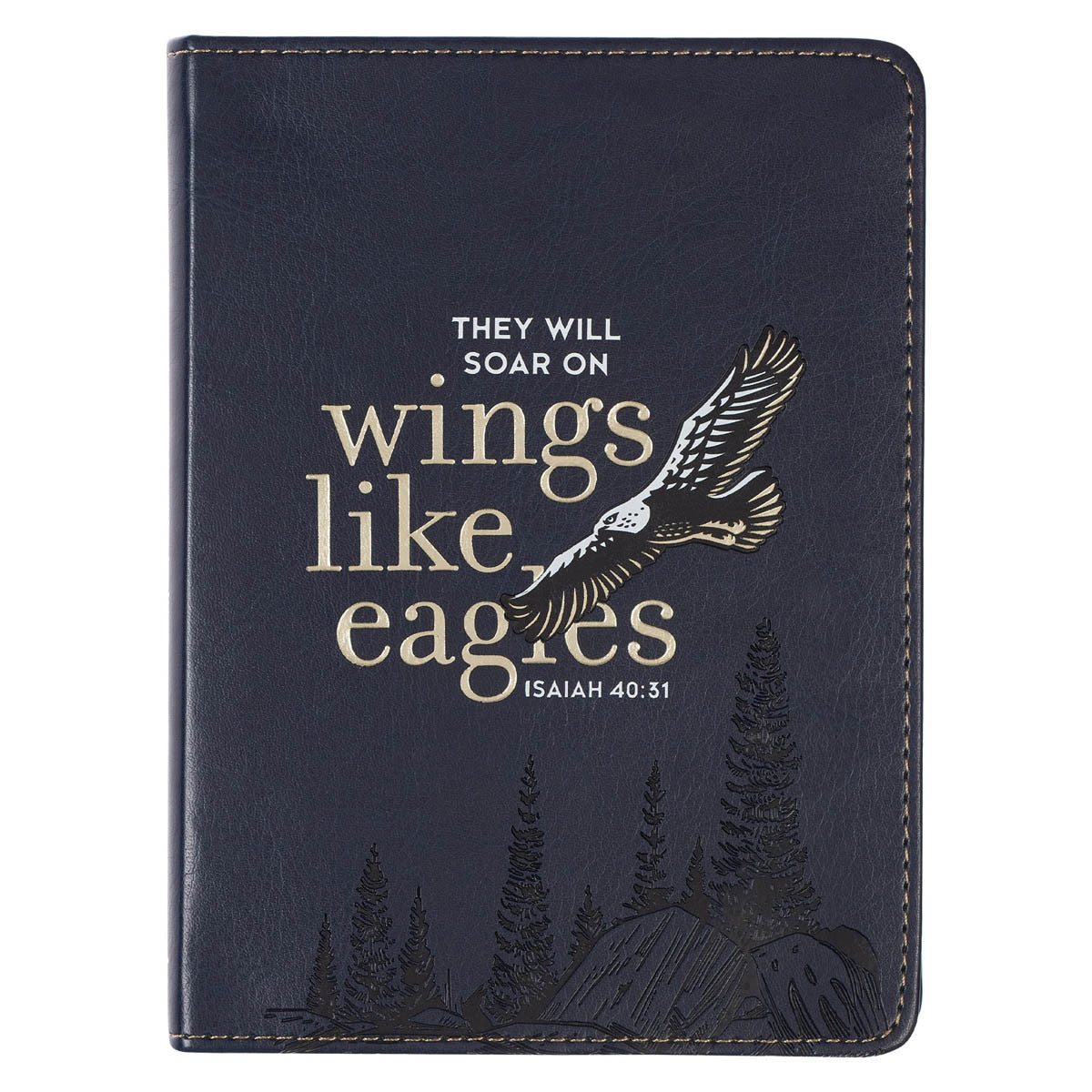 The Wings Like Eagles Navy Blue Handy-sized Faux Leather Journal will stay your mind on the mighty God we serve as you record your thoughts and prayers on its pages.